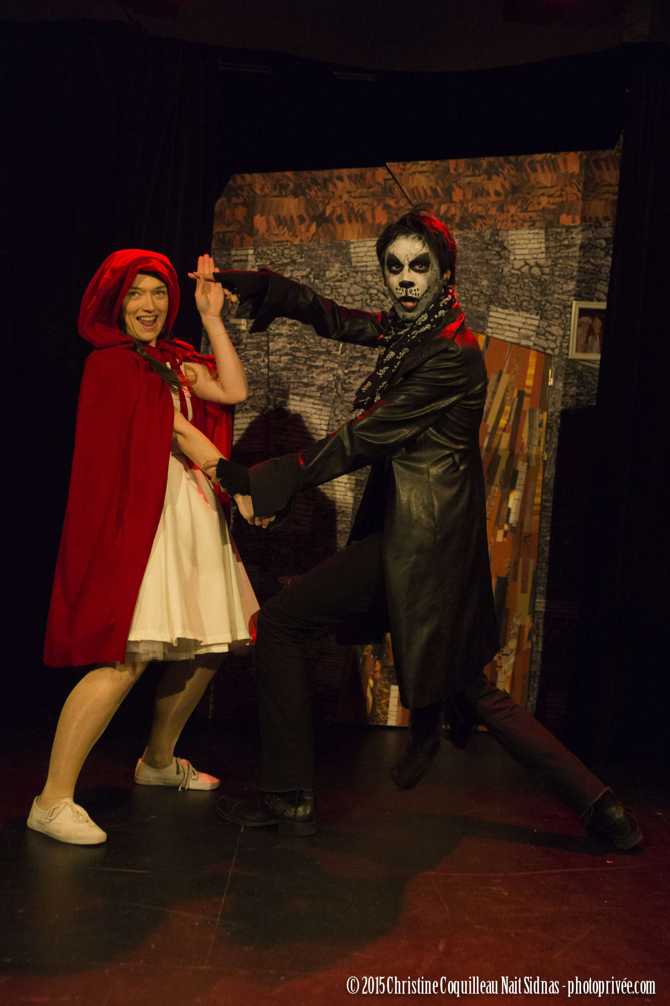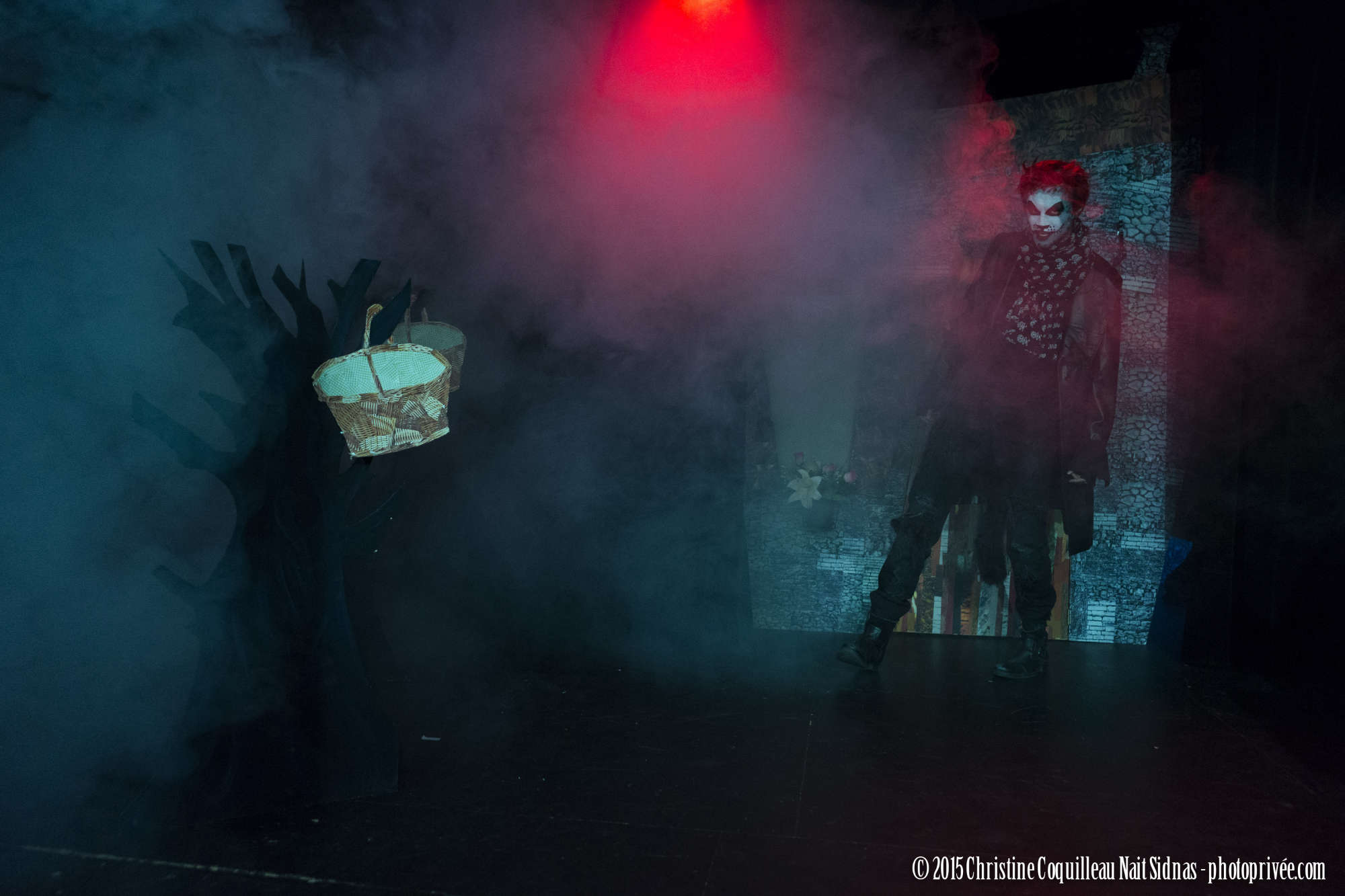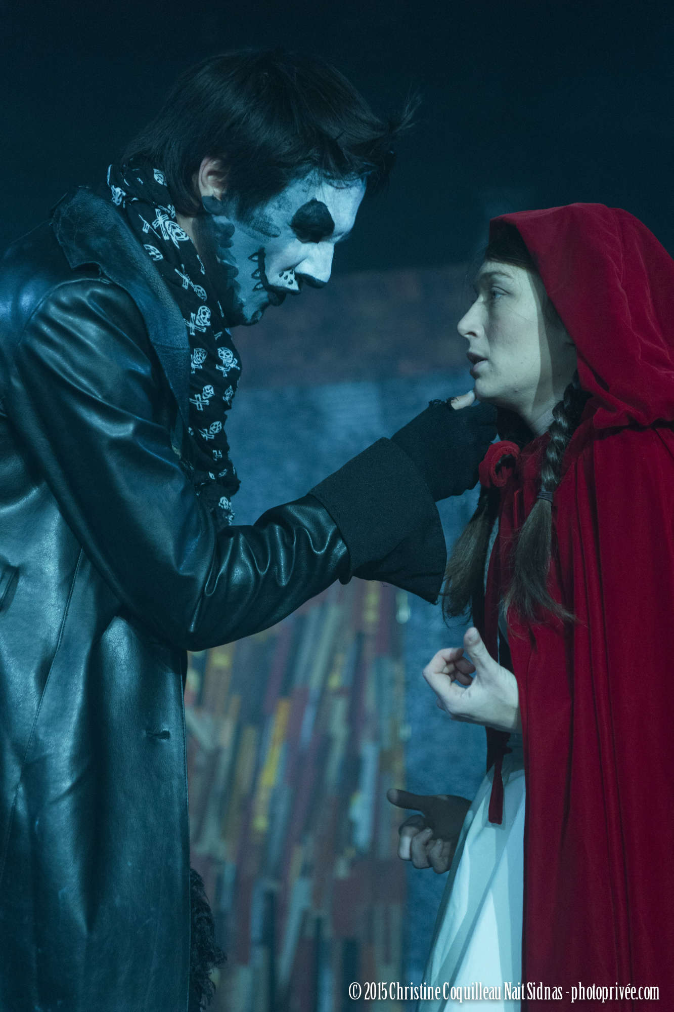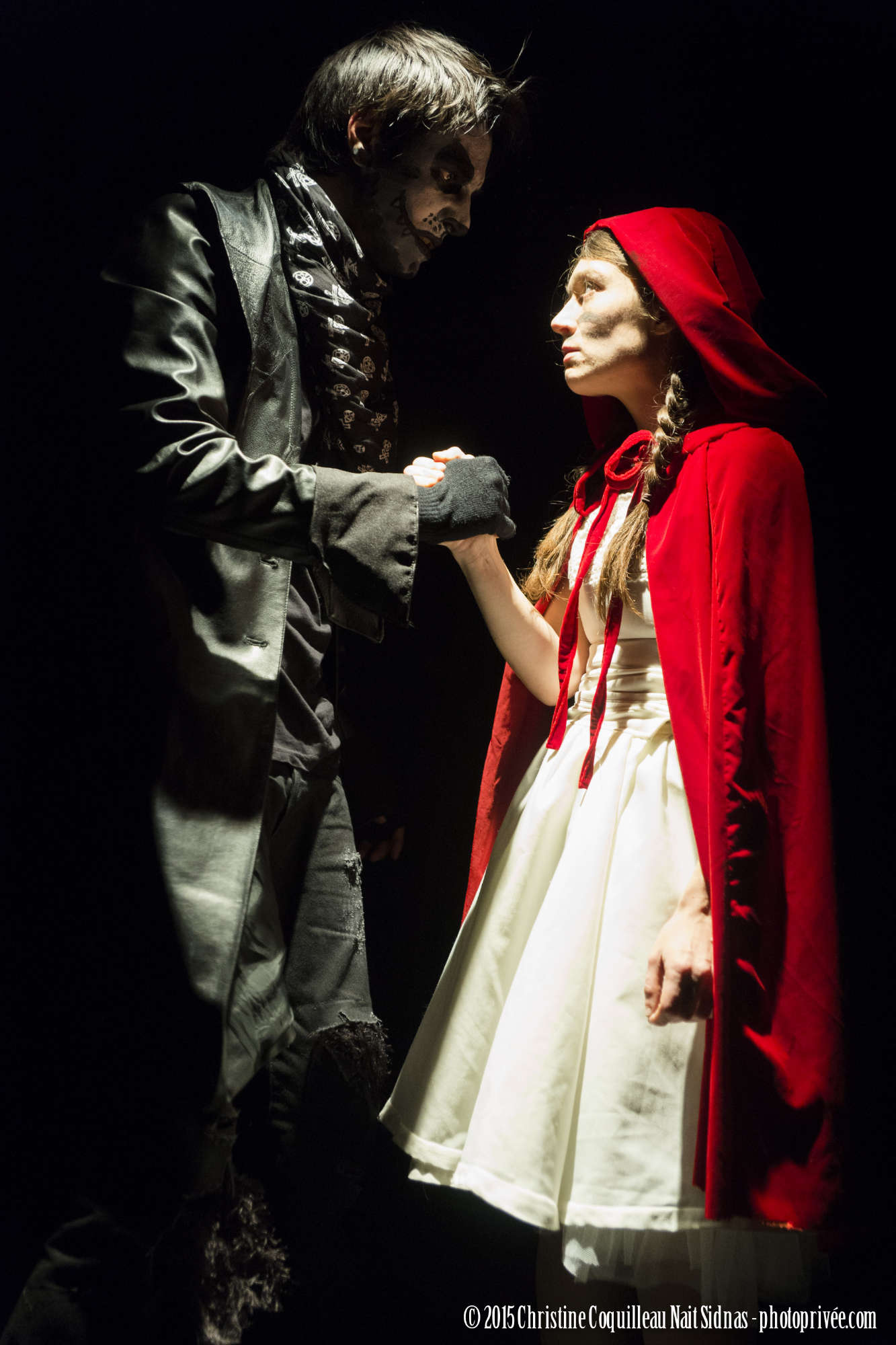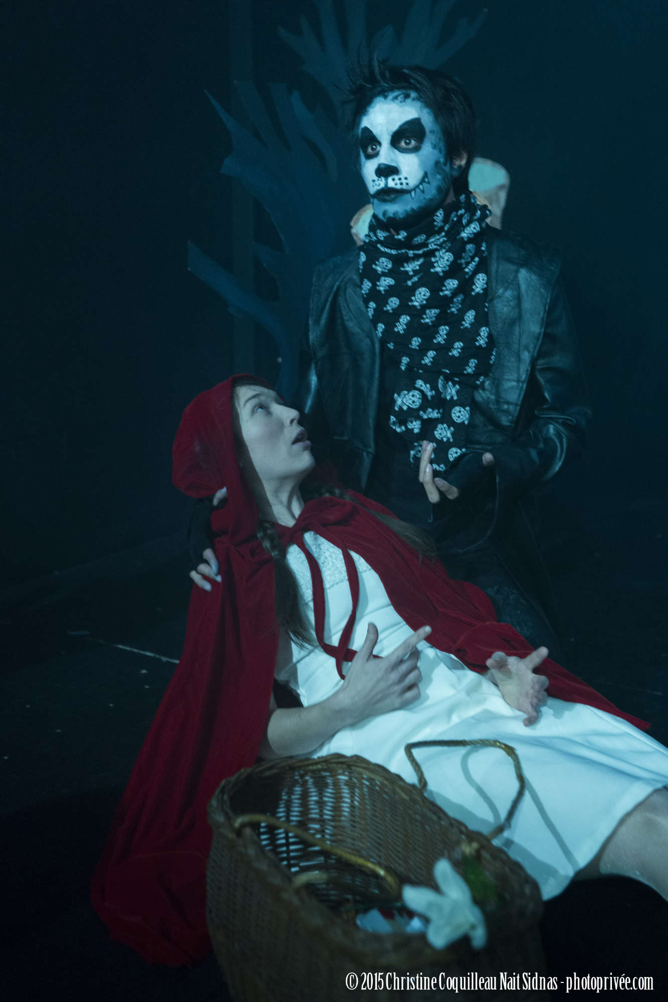 Il se triture les méninges pour trouver les ingrédients nécessaires à l’élaboration d’un conte “qui fait peur”, aidé d’un accessoiriste facétieux. Ce qu’il imagine se joue alors sous les yeux du spectateur, se transforme et s’améliore malgré un loup récalcitrant qui ne veut pas faire ce que l’auteur lui demande. C’est finalement Marie-Jeanne qui lui soufflera les clés de l’histoire du Petit Chaperon rouge.